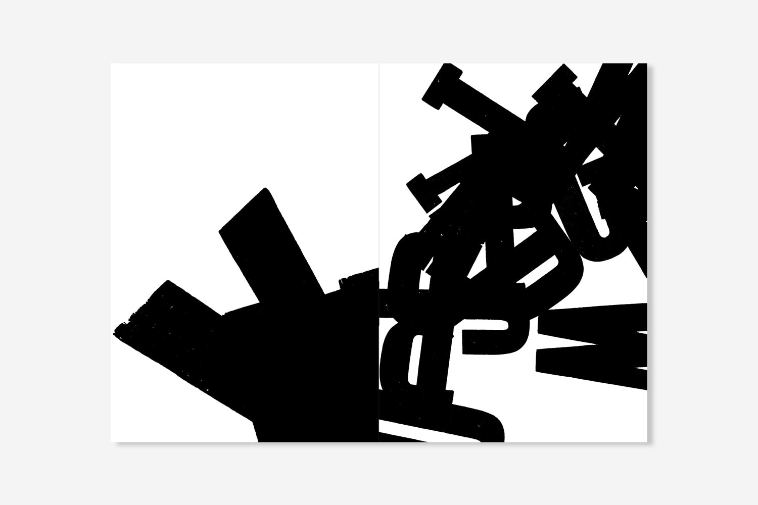 For each page of the publication a separate piece of code generates new artwork through the combination of fixed and variable parameters. The number and size of letterforms are fixed, while their placement and angle of rotation is random.